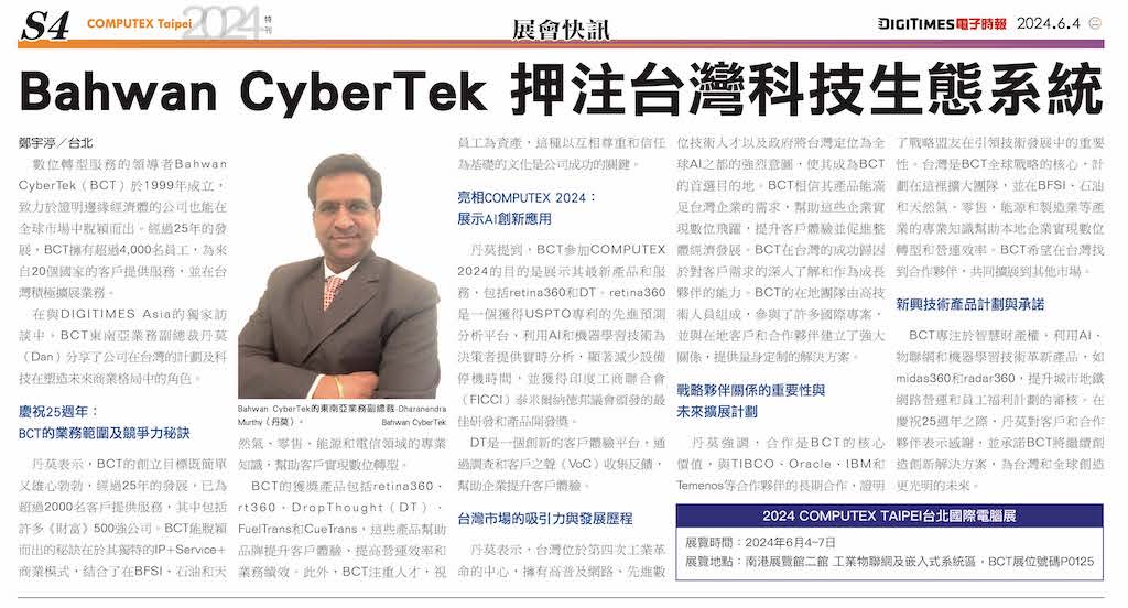I was recently featured in Digitimes Asia, discussing Bahwan CyberTek’s journey, our technology vision, and plans for growth in the Taiwan and Asia-Pacific markets. Discover key insights from the interview and my perspective on industry trends by reading the full post here.